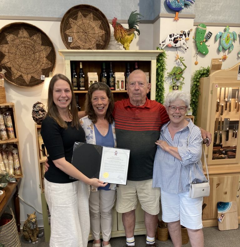 I dropped in the Kitchen Witch and just like clock work, owner Bill Davidson was there delivering coffee to his daughter Ann Jabalee as he has done at 2 pm for many years. And…it was a real treat to meet Mary Davidson who has also played a huge part in the success of this magical, whimsical store in Bridgewater. I had the honour of presenting them all with a copy of the Members Statement that I read in the Nova Scotia legislature.